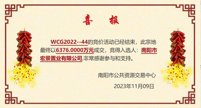 11月9日上午,南陽投資集團下屬子公司南陽市宏景置業(yè)有限公司以6376萬元的價格成功摘得伏牛路以東、規(guī)劃區(qū)間路以南WCG2022-44地塊,這是繼宏景·豐和苑、宏景·豐實苑之后的又一次重磅拓新,熱土之上,必將再創(chuàng)傳奇!