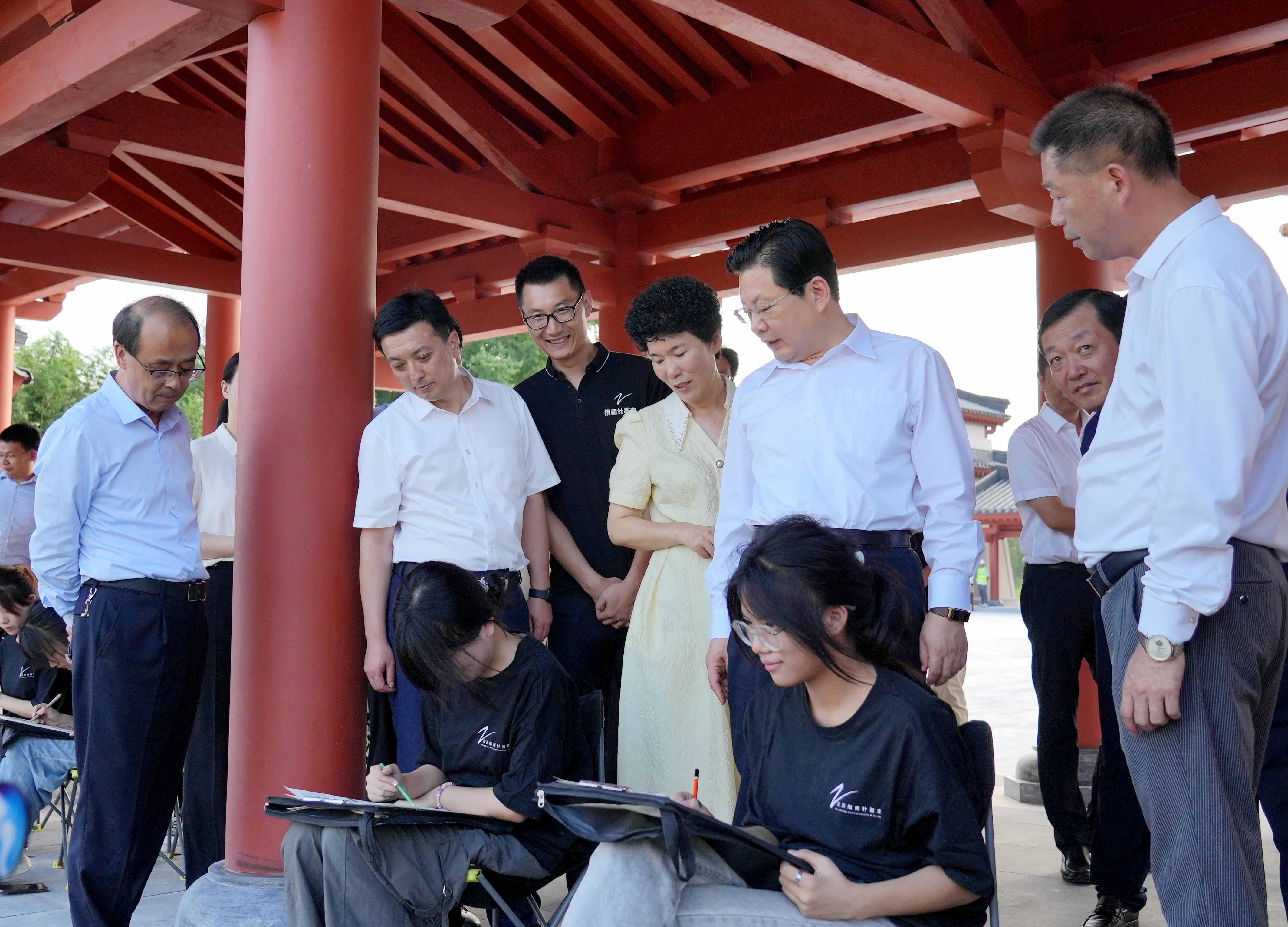 調(diào)研現(xiàn)場,醫(yī)圣文化園一區(qū)主體高臺建筑威嚴(yán)莊重,紅墻黃瓦頗具古意,景觀綠化初具規(guī)模,起舞的漢服愛好者、沿河寫生的學(xué)生、廊下習(xí)琴的少年引得朱是西一行饒有興致地駐足觀看并與大家親切交談。朱是西邊走邊看邊研究,與相關(guān)工作人員就全面加快項(xiàng)目建設(shè)進(jìn)度、運(yùn)營策劃設(shè)計(jì)、文旅底蘊(yùn)挖掘等方面進(jìn)行了交流,并提出了指導(dǎo)意見。調(diào)研結(jié)束后,朱是西召開現(xiàn)場會議,詳細(xì)聽取了項(xiàng)目相關(guān)工作推進(jìn)情況的匯報(bào)。集團(tuán)黨委書記、董事長劉九利在匯報(bào)中表示,南陽投資集團(tuán)堅(jiān)決按照朱書記指示,圍繞提高游客人數(shù)和旅游收入“兩個(gè)提高”的要求開展運(yùn)營籌備工作,著力打造活化演繹來提升游園體驗(yàn),組織系統(tǒng)活動來豐富游園內(nèi)容,打造夜間游玩項(xiàng)目來提升旅游收入,做強(qiáng)仲景書院運(yùn)營來帶動游園人氣,堅(jiān)決把市委市政府交給集團(tuán)的資源運(yùn)營好、經(jīng)營好,為全市人民和外地游客打造中醫(yī)朝圣和中醫(yī)藥文化體驗(yàn)的圣地。