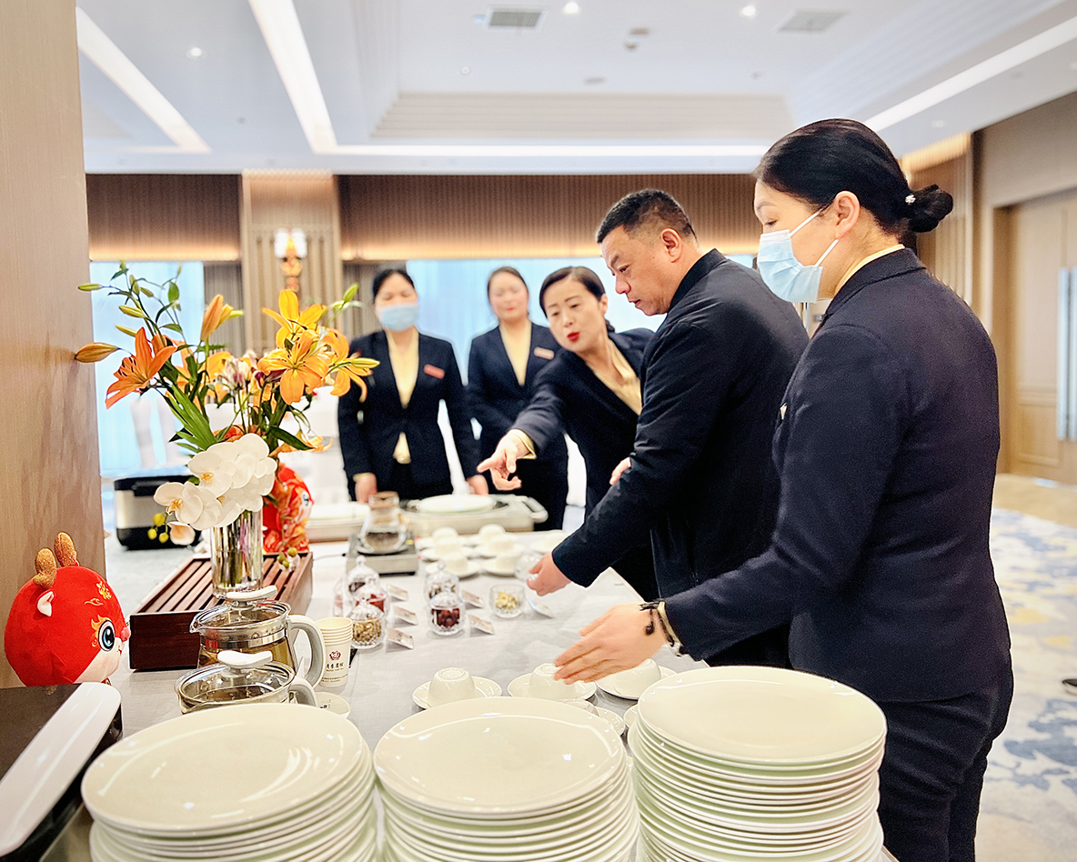 在南陽賓館,紀監(jiān)組詳細詢問了會議期間食宿保障、會務服務等情況,檢查了餐廳操作區(qū)域衛(wèi)生情況以及食品留樣情況,親身感受了賓館養(yǎng)生茶臺的溫馨服務,馬馳對南陽賓館提供的個性化服務表示肯定,并明確了茶歇區(qū)域的飲品提供標準。韓玉奇指出,此次南陽賓館、月季賓館組織近300人,舉全賓館之力參與“兩會”服務保障工作,領導團隊全天駐守,堅持在一線抓思想動員、在一線抓安全保障、在一線抓服務落實,為各位參會代表提供優(yōu)質、專業(yè)、安全的接待服務,并收到了多封表揚及感謝信,月季賓館、南陽賓館將嚴格按照“兩會”的有關要求和安排部署,充分發(fā)揮南陽政務服務酒店作用,專業(yè)專注、用心用情,綠色辦會、厲行節(jié)約,扎實做好“兩會”服務保障工作。