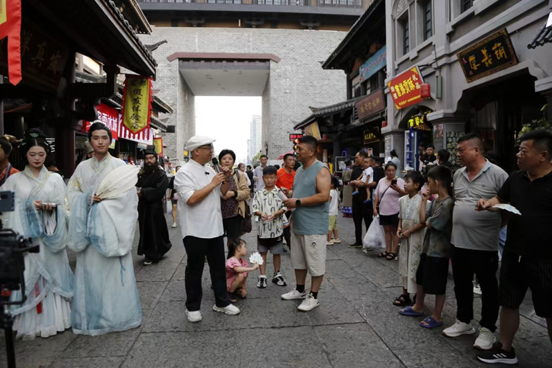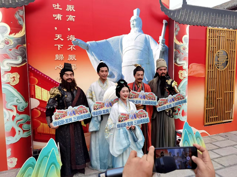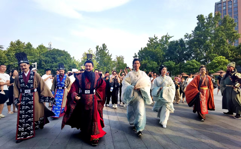 當(dāng)天下午,宣傳推介團(tuán)隊(duì)走進(jìn)許昌胖東來天使城,與許昌熱情市民互動。在曹魏古城和丞相府景區(qū),臥龍崗武候祠景區(qū)演藝團(tuán)隊(duì)扮演的諸葛亮、黃月英、劉備、關(guān)羽、張飛等三國人物吸引了眾多當(dāng)?shù)厝罕娗皝韲^,演員們帶來的情景劇、舞蹈和互動游戲受到當(dāng)?shù)厝罕?、游客的連連稱贊。現(xiàn)場還通過游客互動、搶答三國歷史文化問題等形式,向游客贈送我?guī)埦皡^(qū)門票以及旅游宣傳資料?;顒蝇F(xiàn)場人氣火爆,大家紛紛表示要到到南陽走一走、看一看,讓更多人關(guān)注南陽、來到南陽、愛上南陽。