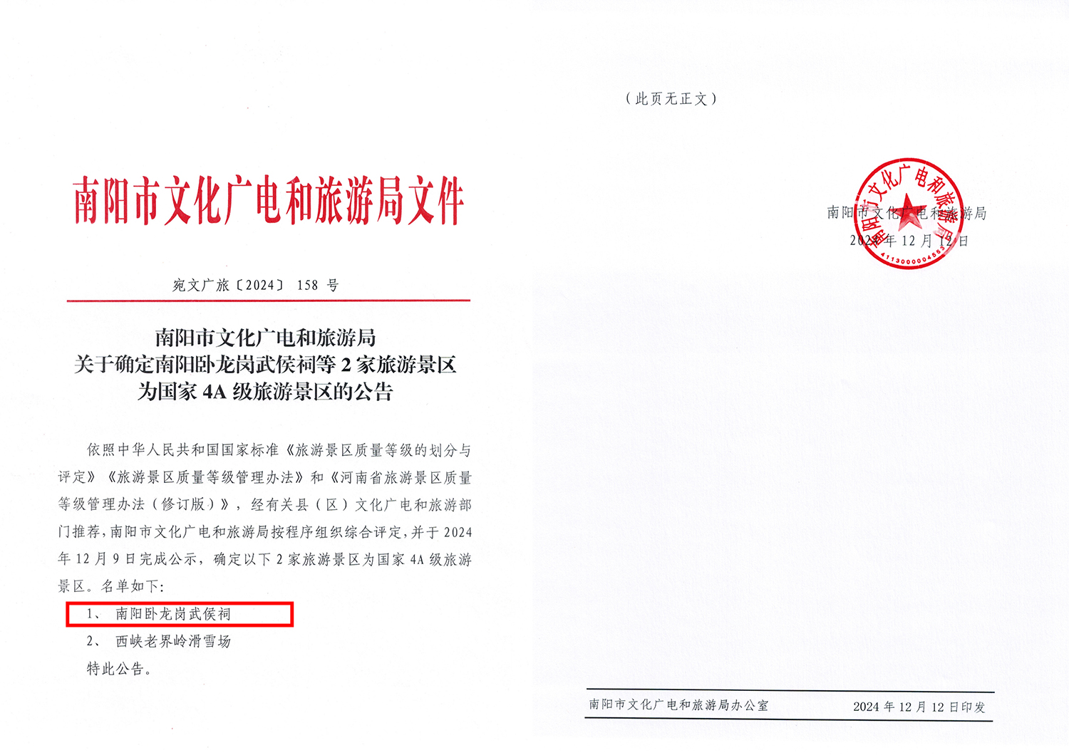 喜報(bào)傳來(lái),振奮人心!依照中華人民共和國(guó)國(guó)家標(biāo)準(zhǔn)《旅游景區(qū)質(zhì)量等級(jí)的劃分與評(píng)定》《旅游景區(qū)質(zhì)量等級(jí)管理辦法》和《河南省旅游景區(qū)質(zhì)量等級(jí)管理辦法(修訂版)》,南陽(yáng)臥龍崗武侯祠經(jīng)過(guò)綜合評(píng)定,被正式批準(zhǔn)為國(guó)家AAAA級(jí)旅游景區(qū)!