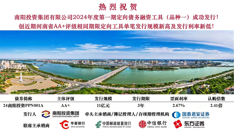 10月25日,南陽(yáng)投資集團(tuán)2024年第一期定向融資工具(24南投集團(tuán)PPN001)成功發(fā)行,金額11億元,期限3年,票面利率2.67%,全場(chǎng)倍數(shù)2.41倍,聯(lián)席主承銷商為國(guó)泰君安證券、東方證券、中信銀行、郵儲(chǔ)銀行、華夏銀行,創(chuàng)近期河南省AA+評(píng)級(jí)相同期限定向工具單筆發(fā)行規(guī)模新高及發(fā)行利率新低!
