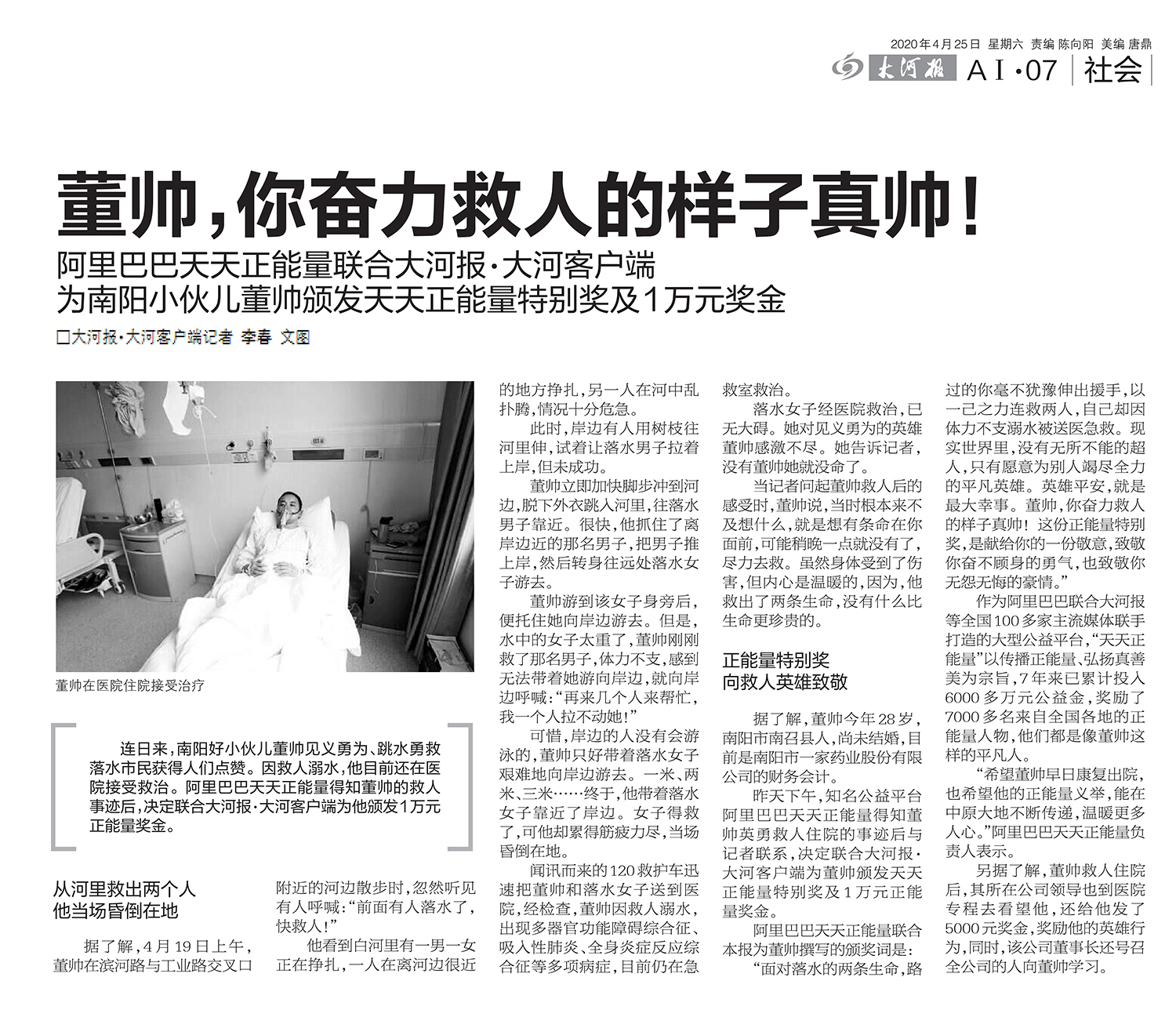 2020年4月19日,濱河路與工業(yè)路交叉口附近的河邊一男一女落水,散步路過(guò)的董帥不顧個(gè)人安危,挺身而出,以一己之力連救兩人,自己卻因體力不支溺水被送醫(yī)急救,因多器官功能障礙綜合征、吸入性肺炎、全身炎癥反應(yīng)綜合征等多項(xiàng)病癥在醫(yī)院治療十余日。2021年12月,董帥被臥龍區(qū)授予“見(jiàn)義勇為”榮譽(yù)稱號(hào)。