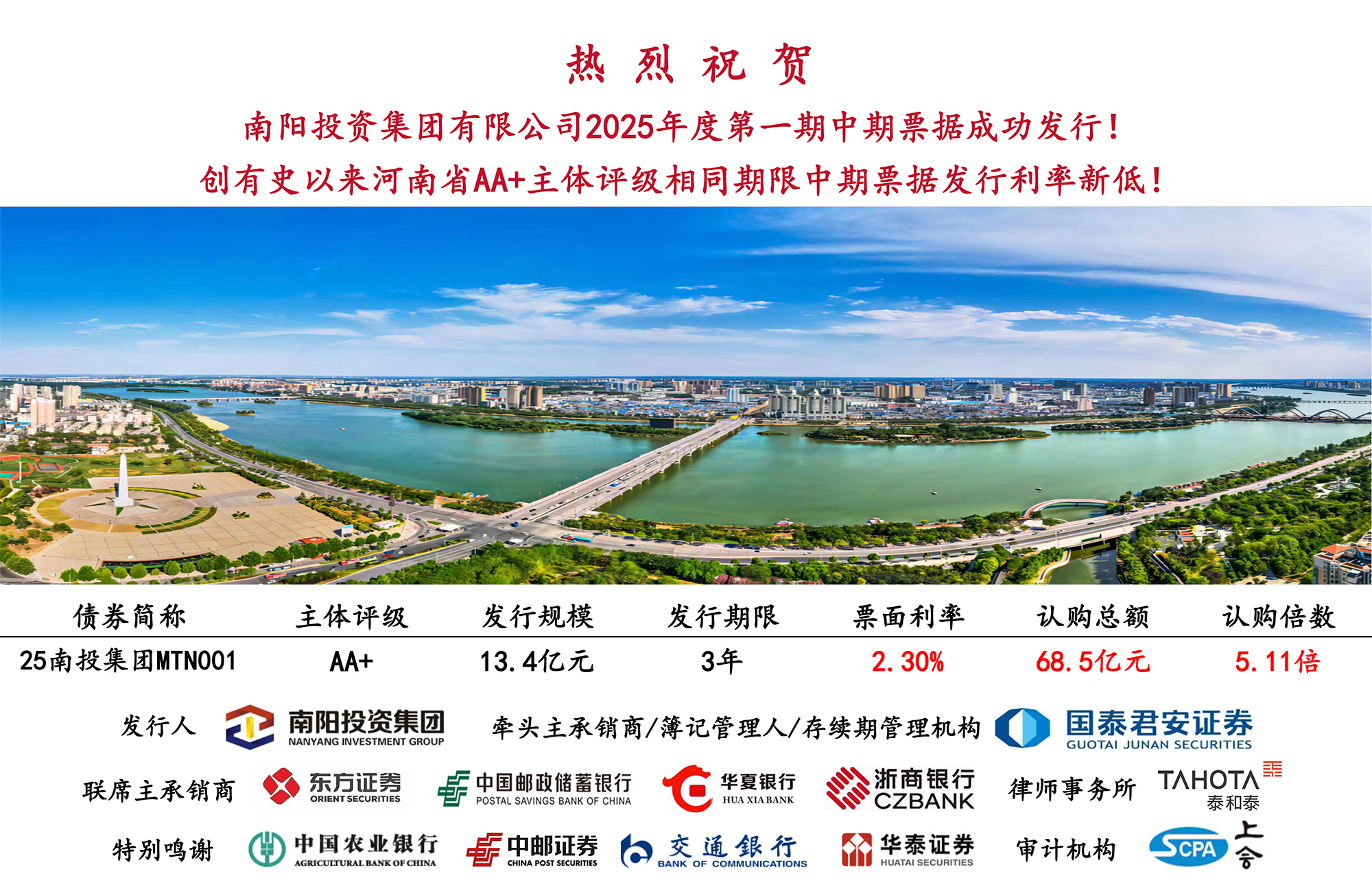 在債券市場波動加劇的背景下,一級市場發(fā)行難度大幅增加。面對嚴峻的市場環(huán)境,南陽投資集團在市委、市政府的堅強領(lǐng)導(dǎo)和大力支持下,強化銀企協(xié)同、精準把握發(fā)行窗口,自獲得批復(fù)至實際發(fā)行用時不足7天,贏得了多元化投資者的充分信任,凸顯了優(yōu)質(zhì)國企資產(chǎn)的配置價值和市場吸引力。2.30%的票面利率與5.11的認購倍數(shù),充分彰顯出資本市場對南陽投資集團發(fā)展戰(zhàn)略、綜合實力和未來前景的堅定信心。